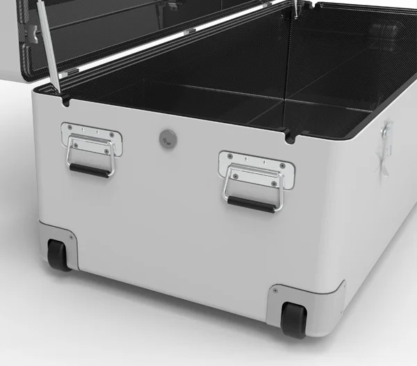 These units are designed for secure stacking. Each one features four marine-grade non-slip rubber feet, which interlock with recesses on the lid of the unit below. For easy lifting, there are four large side handles, which also serve as sturdy tie-down points for added stability and security.