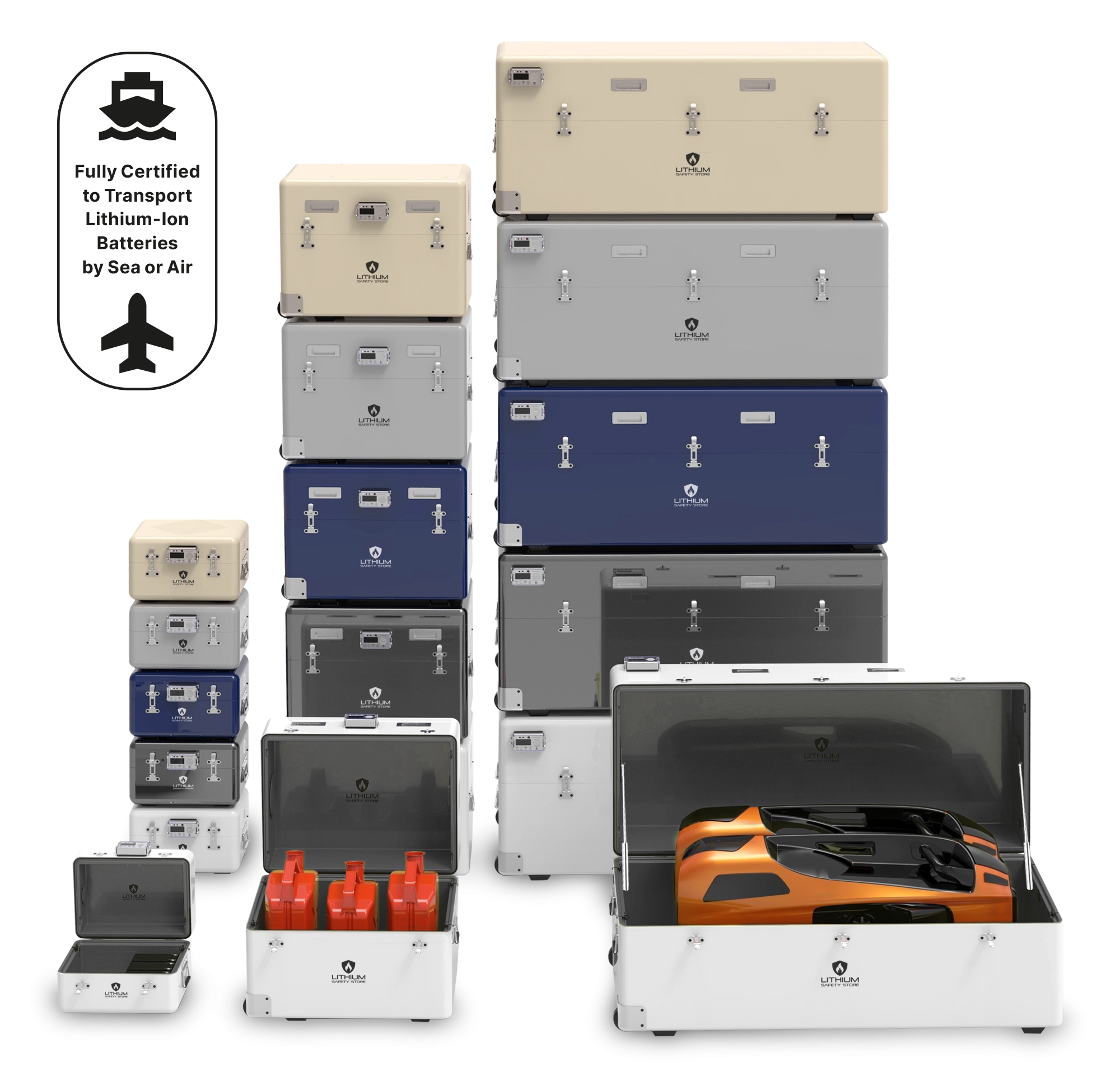 With three different sizes there is a Lithium Safety Store™ for every application. The larger size to fit all iAQUA and Seabob sea scooters, plus electric/dock scooters. A medium size for larger e-foil and e-surfboard removable batteries, e-bike batteries, fuel cans, and gas bottles. Plus, a smaller size for storage of flares, gas canisters, flammable liquids, plus storage and safe charging of smaller lithium batteries found in walkie-talkies, torches, drones, smaller toys and power tools.